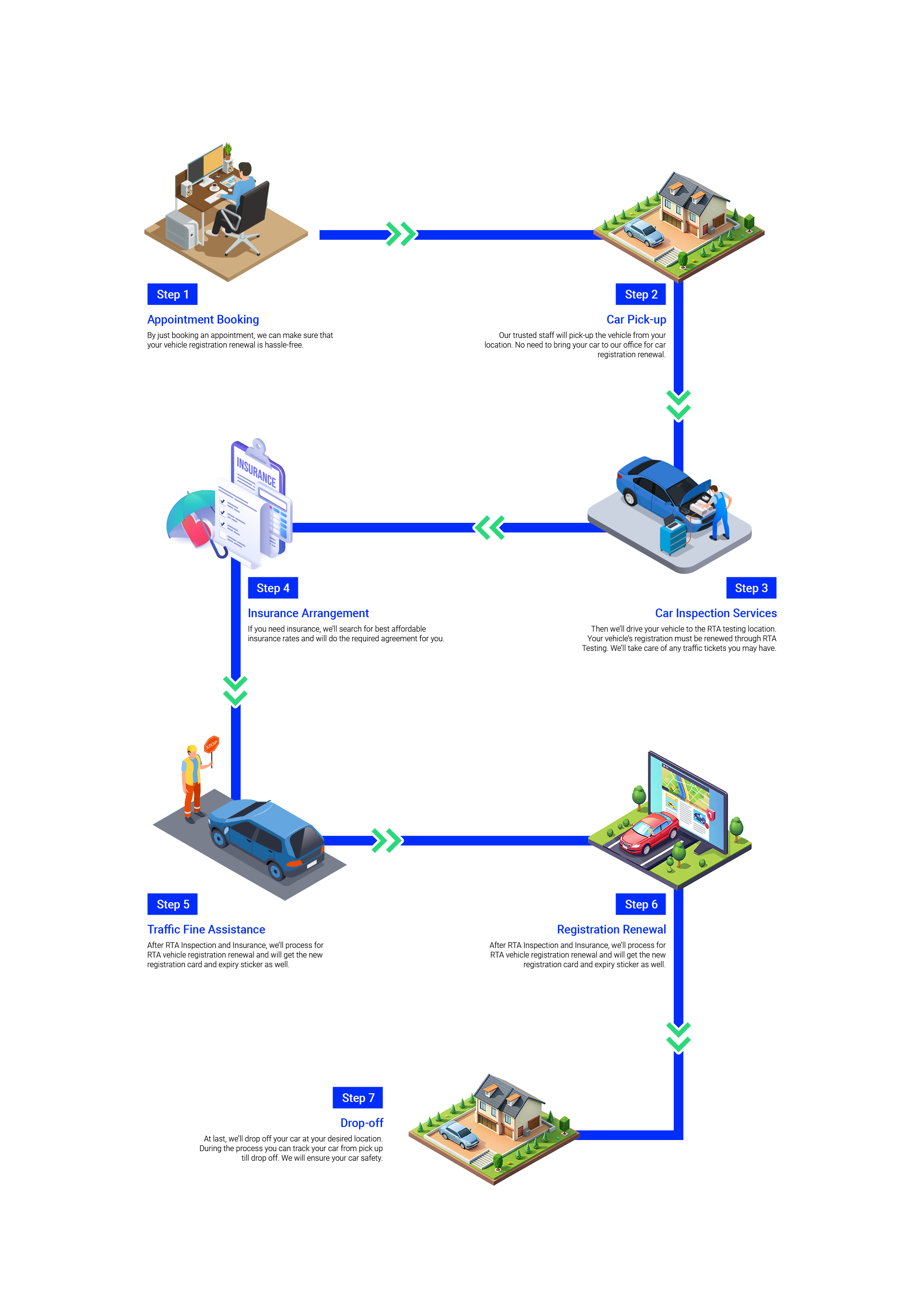We pick up your car and complete the RTA inspections, renewals, and registrations on your behalf, allowing you to stay comfortably at home or work.